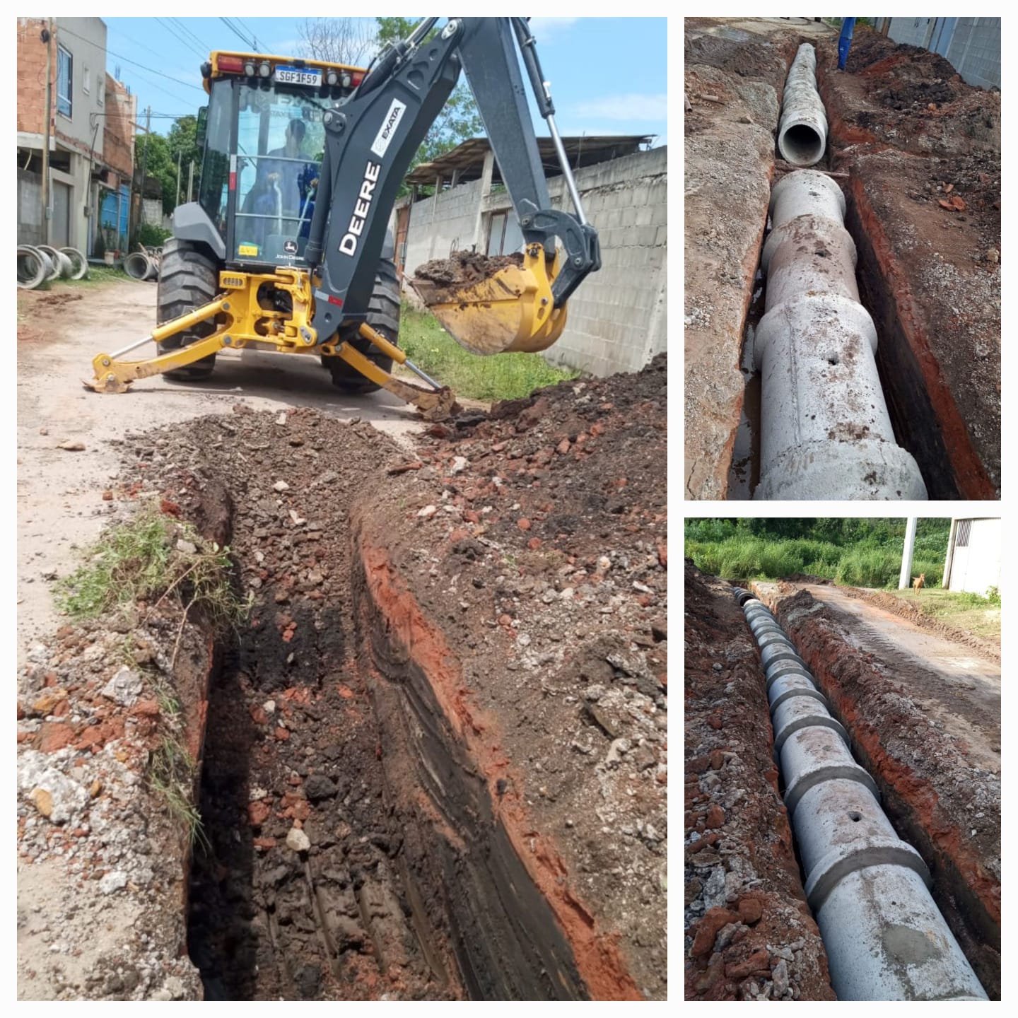 Estão sendo realizados trabalhos de escavação para assentamento da rede de drenagem de 600mm; berço de concreto; esgotamento da água; reparo de tubulações de esgoto; e assentamento de manilha de 600mm.