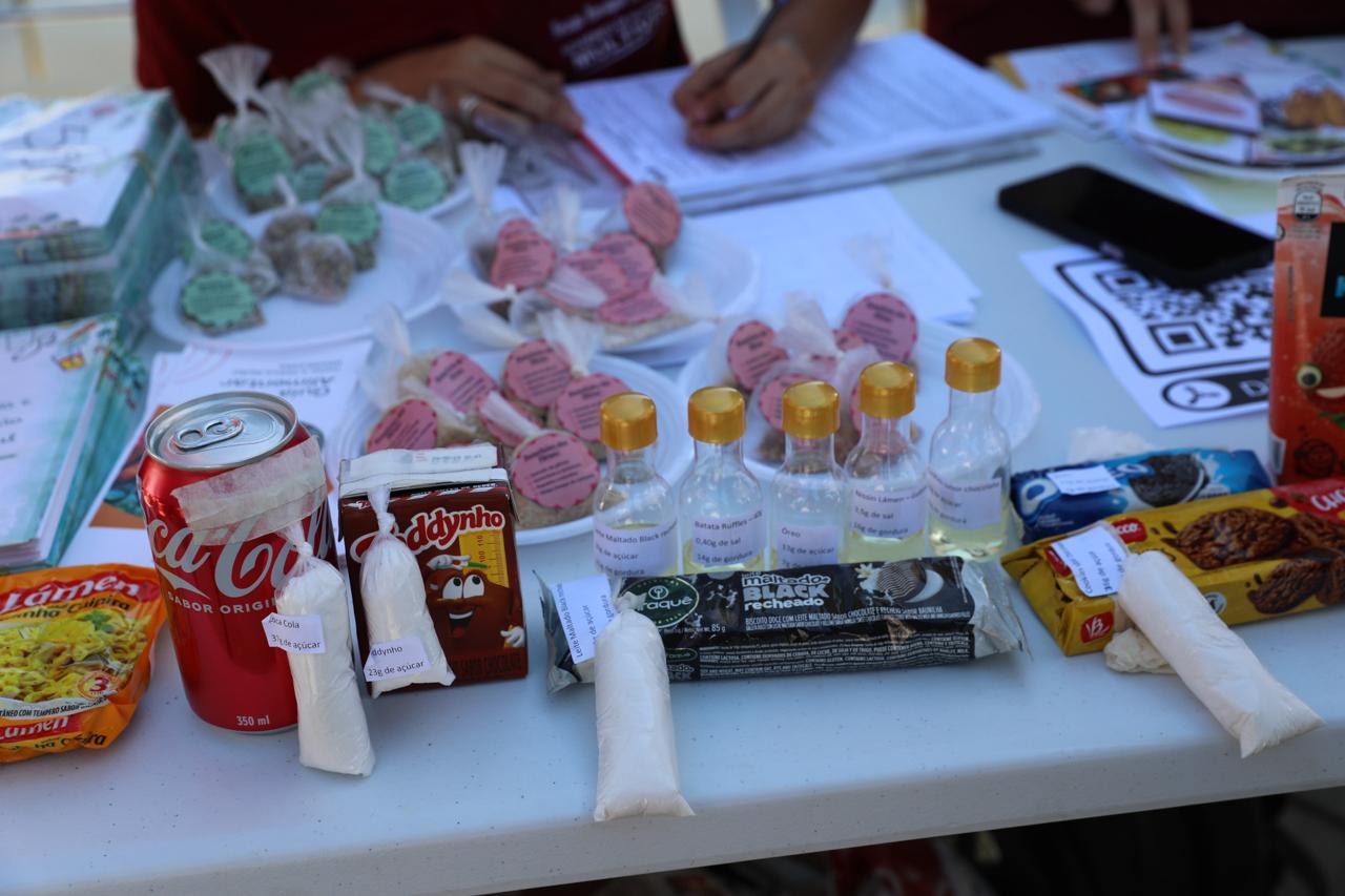 Na tenda também foram disponibilizados vários exemplos de produtos com a quantidade de açúcar e gordura em alguns alimentos ultraprocessados. Também houve distribuição de sachês contendo fibras e sal de ervas.