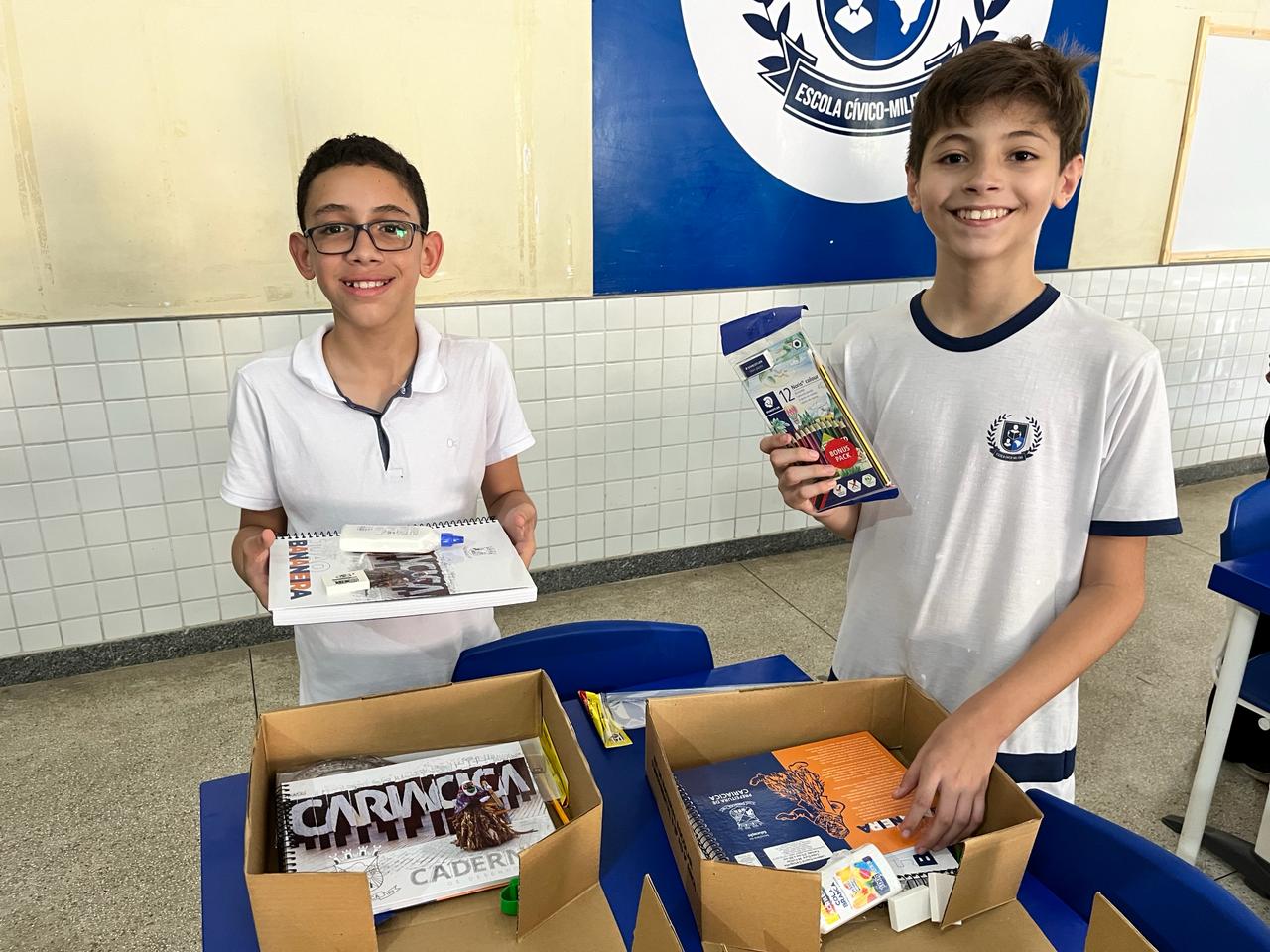 Uma caixa com transferidor, esquadro, régua, tesoura, lápis de cor, borracha...enfim, a lista é grande. Nesta sexta-feira (23), 330 alunos do 6º ao 9º anos do ensino fundamental da Escola Cívico-Militar Cel PM Orlady Rocha Filho, em Itanguá, receberam o kit escolar, que também é composto por lápis de escrever, cola, caderno de artes, caderno em espiral capa dura, apontador e caneta vermelha e azul.