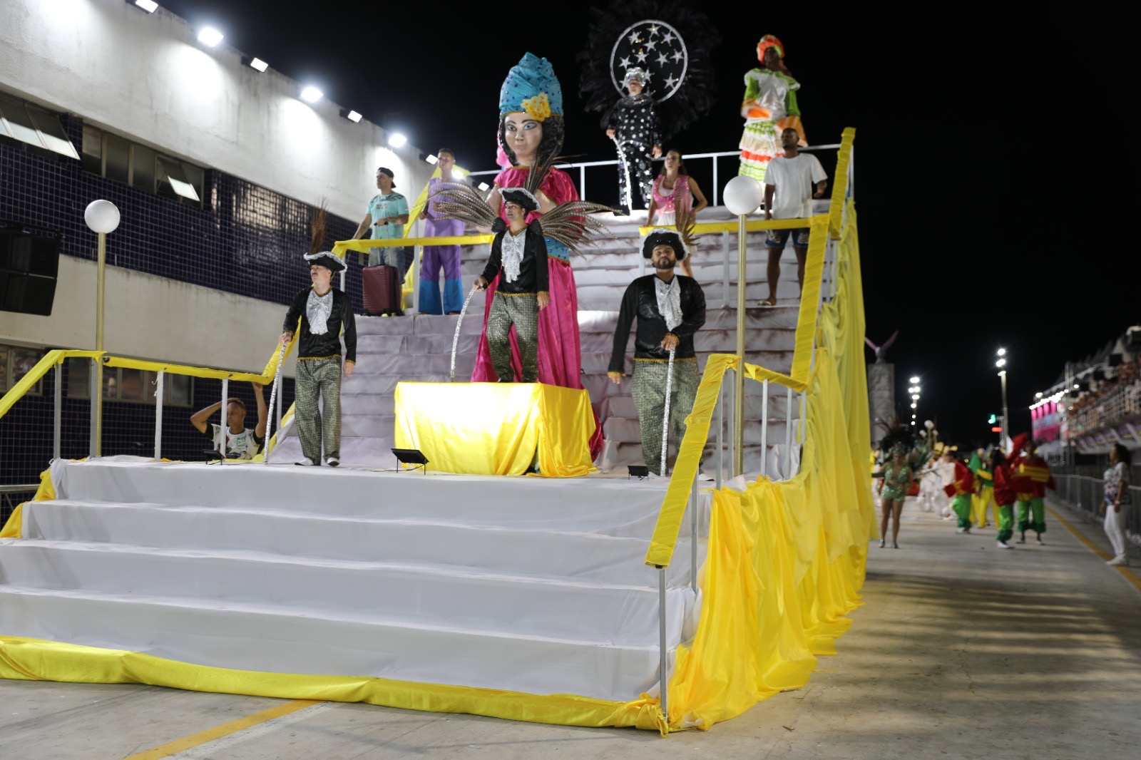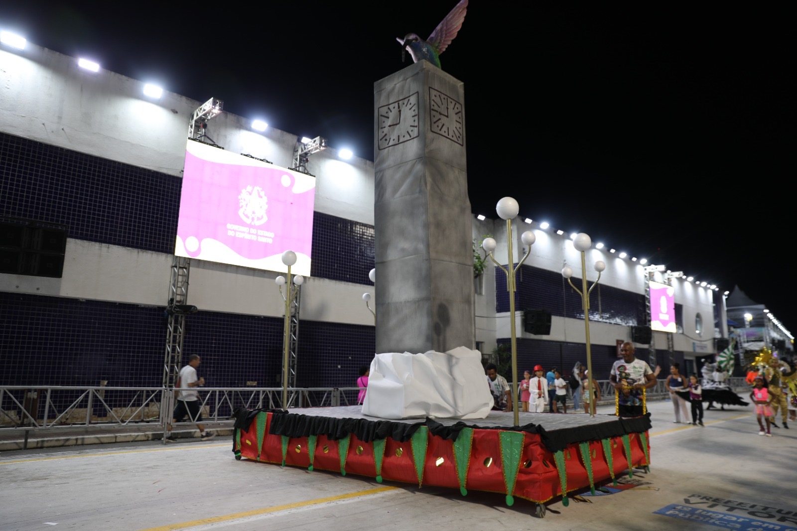 Depois do tripé que carregava o nome da escola e o mascote, que é um colibri, o carro principal apresentou a escadaria que leva o nome de Maria Ortiz, além de representações dela ao longo da vida.