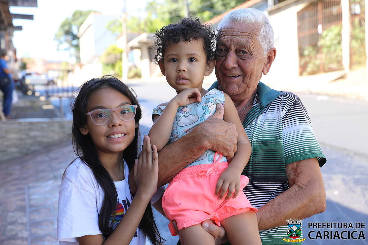 O pintor jatista Sebastião Araújo Neto, de 72 anos, mora em Vista Mar há 40, e acompanhou o trabalho na rua onde mora, a Gustavo Dupper. Ele estava com as netas Sofia, 9 anos, e Safira, 2. 'A rua tinha muito buraco. A mudança foi muito bem-vinda e a equipe está de parabéns!', comemorou.