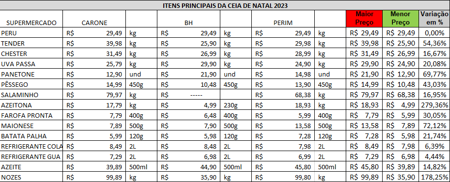 O Procon de Cariacica realizou uma pesquisa comparativa de preços dos principais produtos que compõem a ceia de Natal em três principais supermercados da cidade. Foram analisados os valores de diferentes marcas de itens, como a uva passa, panetone, salaminho, maionese, nozes, entre outros alimentos. A maior diferença entre preços ficou por conta da azeitona, com 279%. Já a menor diferença foi alcançada pelo peru: nos três supermercados ele custa R$ 29,49 o quilo.
