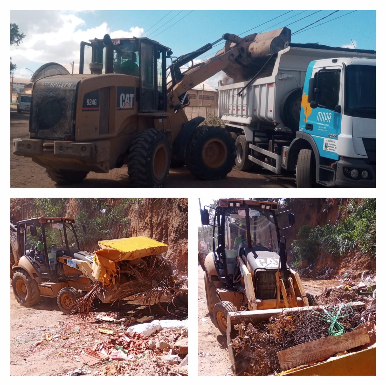 Estão sendo usadas 15 caçambas truck, quatro pás carregadeiras e duas retroescavadeiras no trabalho de recolhimento de resíduos que são despejados de forma irregular nas ruas.
