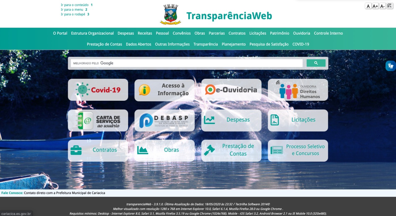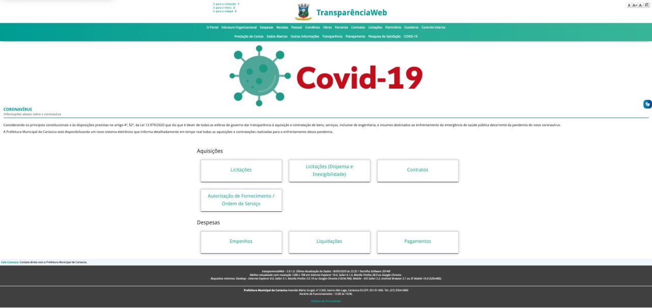 Para conhecer o conteúdo dessa nova medida de transparência, o cidadão deve acessar o site da prefeitura - www.cariacica.es.gov.br -, clicar em um banner e ser direcionado para o botão Covid-19. Também há no site outro caminho para o internauta ter acesso ao conteúdo: na aba transparência Lá, encontrará dois caminhos para localizar a informação que procura: no topo da página, na aba Covid-19 ao lado de outros serviços do portal e no botão de atalho.
