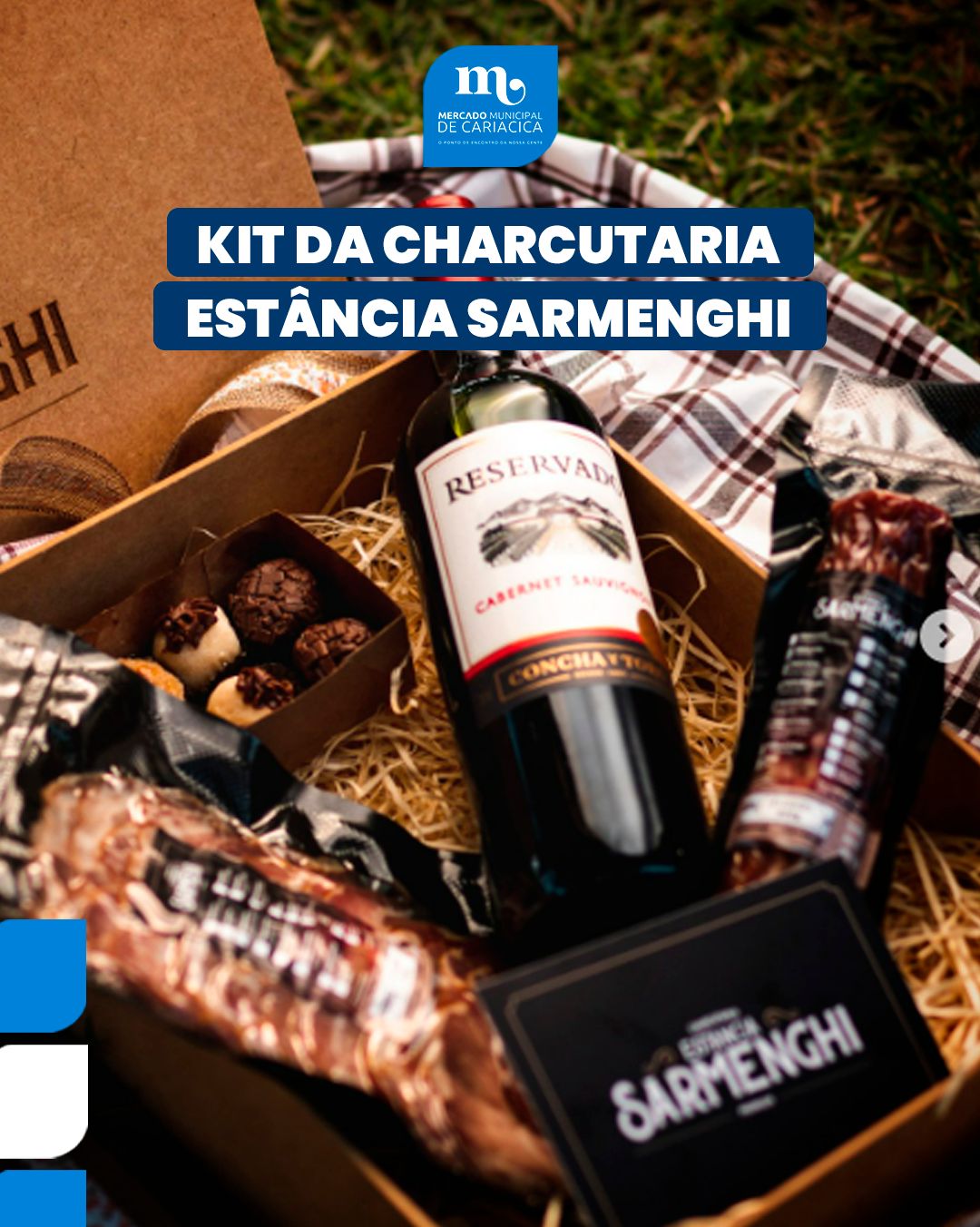 Um kit recheado de itens da Estância Sarmenghi também é uma das opções disponíveis no Mercado. A Estância Sarmenghi é uma charcutaria 100% artesanal e natural de Cariacica, que vende linguiças, salaminhos, cortes curados, maturados e defumados.