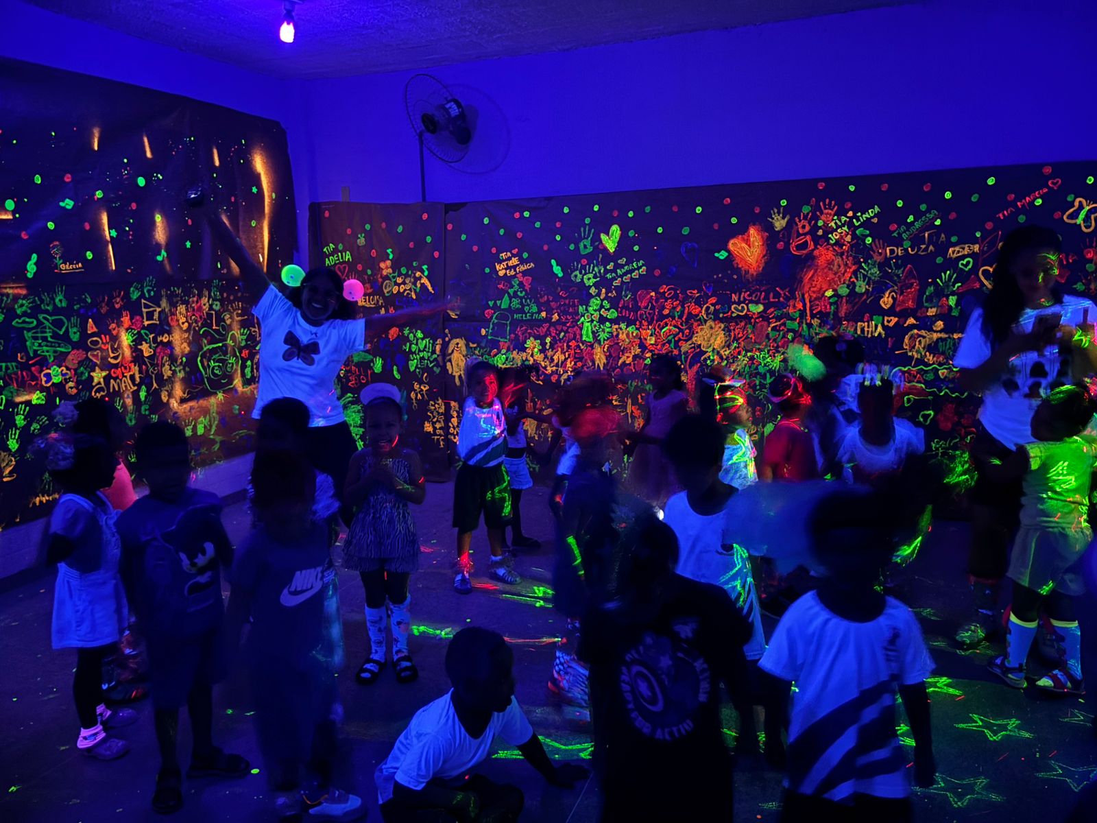 Depois de colocarem a mão na massa, na quarta-feira (8), veio a grande surpresa: sob as luzes negras, os desenhos feitos por eles ganharam vida e encantaram os pequenos. Para completar, teve até uma baladinha neon, com jogos de luzes, música e muita diversão.