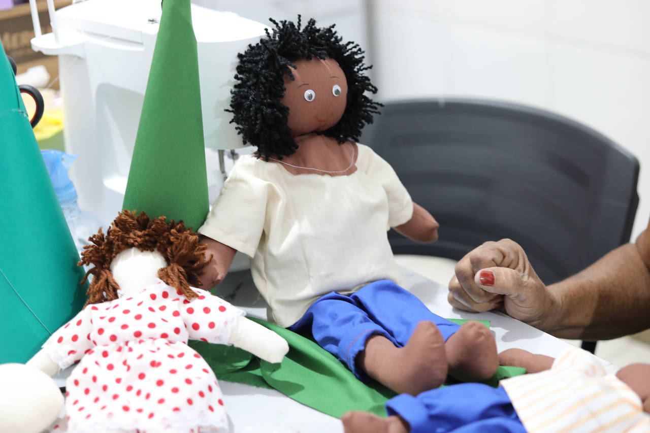 As bonecas e pelúcias estão sendo confeccionadas com tecido, papelão, lã, botões, algodão, plumante para enchimento e muita dedicação dos idosos. Além disso, todos os brinquedos estão sendo personalizados, refletindo a diversidade étnica e de gênero, utilizando diferentes tons de pele, texturas de cabelo e vestimentas variadas.