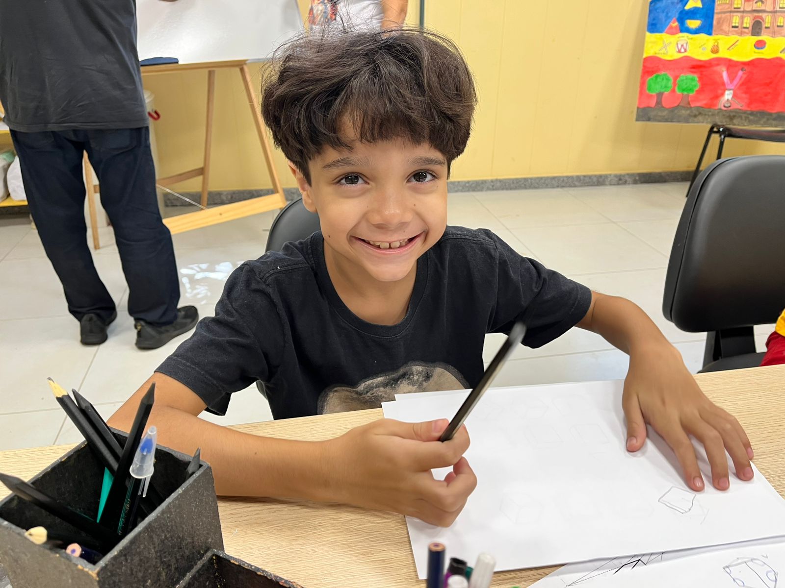 Atentos às orientações, os participantes acompanharam as atividades com entusiasmo. Benjamim Coutinho, de 8 anos, não parou de desenhar durante a oficina. “Eu gosto muito de desenhar. O tio entregou uma folha com cubos e pediu para eu fazer igual. É muito legal, estou gostando muito”, contou.