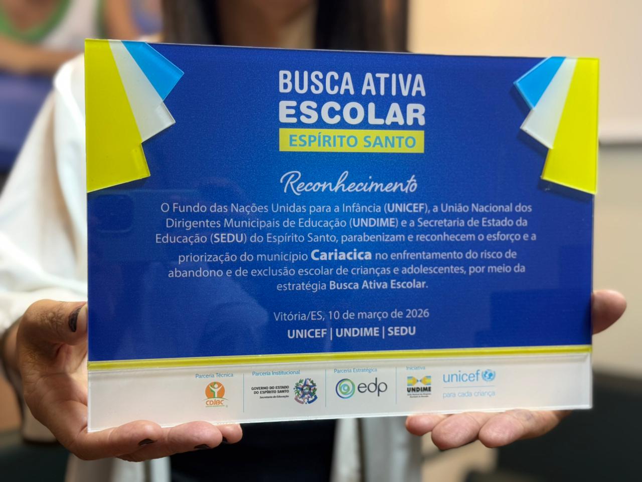 O reconhecimento foi concedido pelo UNICEF, pela União Nacional dos Dirigentes Municipais de Educação e pela Secretaria de Estado da Educação do Espírito Santo (Sedu), durante o evento “Busca Ativa Escolar em Ação: Experiências e Resultados”, realizado neste mês de março, reunindo gestores e equipes municipais de todo o estado.